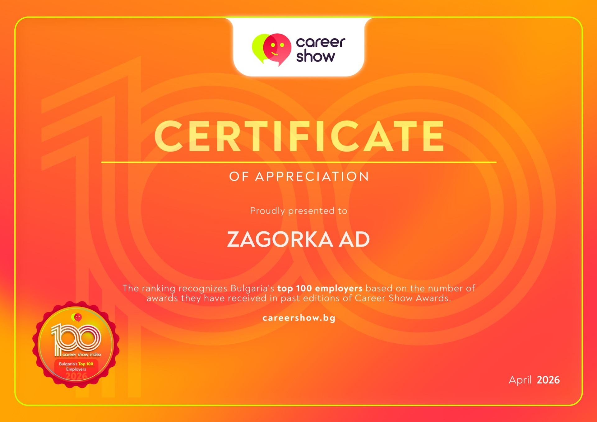 ЗАГОРКА заема 6-о място в националното класиране „Топ 100 най-добри работодатели в България“ за 2026 г., изготвено от Career Show Index.